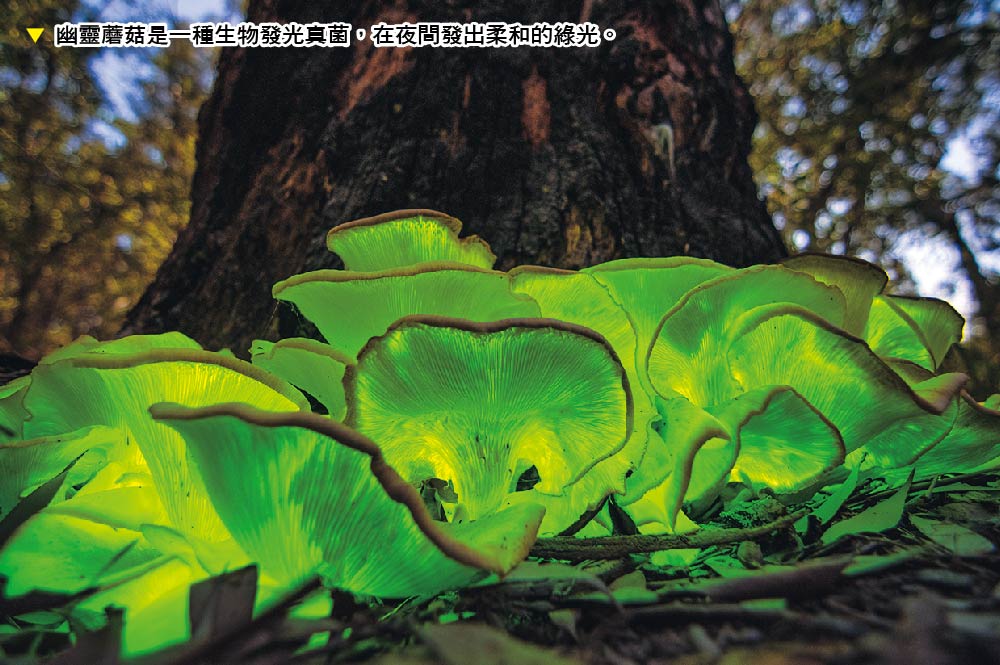 - 在夏夜的森林裡,螢火蟲無疑是受矚目的明 星。當雄螢火蟲在草叢間飛舞時,腹部末端的發光 器不斷閃爍,那是牠們的求愛訊號與溝通密碼。每一種螢火蟲都有專屬的閃爍頻率和節奏,好比一段 段獨特的摩斯密碼,只有同種的雌螢火蟲能正確辨 認並回應。這樣不僅能避免不同物種之間的誤會, 也大大提高了配對成功率。更有趣的是,螢火蟲不 只成蟲會發光,許多螢火蟲的幼蟲甚至卵也能發出 微光,目的是在警告掠食者:「別吃我,我可能有 毒!」這樣的防禦策略也提升了牠們的存活率。 螢火蟲之所以會發光,是因為發光細胞內的螢 光素在螢光素酶的催化下,與氧氣發生氧化反應,從而產生光。除了螢火蟲之外,森林中還藏著會發 光的真菌,被稱為「發光蕈」或「螢光蕈」。這類 會發光的真菌通常生長在潮濕的落葉堆或腐木上, 夜晚會發出淡綠色的光,宛如一盞盞帶有科幻、神 祕氣息的迷你夜燈。科學家推測,其發光目的可能 是用來吸引昆蟲,幫助孢子傳播以利繁衍;但也有學者認為,那可能只是真菌代謝的副產品。無論原 因為何,它都是令人驚嘆的夜間奇景。