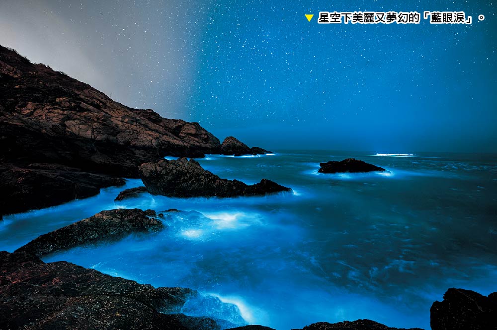 - 生物發光在海洋中非常普遍,尤其是深海區 域。例如住在深海裡的鮟鱇魚,頭上有一根狀似釣 竿的構造,前端還會發光,看起來彷彿提著一盞小 燈籠。其實,那根釣竿狀的構造是由第一背鰭特化 而成,叫做「吻觸手」,前端會發光的「餌球」裡 住著許多發光細菌,所以能在黑漆漆的深海引誘獵 物「上鈎」,當好奇的獵物靠近時,就會被鮟鱇魚 的大嘴一口吞下。 有種烏賊叫做螢烏賊或螢火魷,可以透過發光 來誘捕獵物或吸引異性,受刺激時 2 隻觸手還會發出 強光來威嚇敵人;日本富山灣是螢烏賊的著名產 地,每年 3 到 6 月,螢烏賊會從深海游至淺海產卵, 夜間常被海浪沖上岸,在岸邊形成一片奇幻的藍光 景象。而台灣馬祖每年春夏則會迎來著名的「藍眼 淚」,這是大量的夜光藻(又稱夜光蟲)在受到海 浪、風力或人為擾動時,所發出的藍色光芒,當夜 晚海浪一層層翻湧,整片海面彷彿被撒滿藍色星 辰,美麗又夢幻。 許多水母也會發光,用來吸引獵物、嚇退捕食 者或與其他水母進行溝通。例如水晶水母,牠體內 的發光蛋白(水母素)能在遇到刺激時釋放藍光, 此現象稱為「生物發光」;而其體內的綠色螢光蛋 白(GFP)則會在吸收藍光後轉化成綠光,此現象稱 為「生物螢光」。