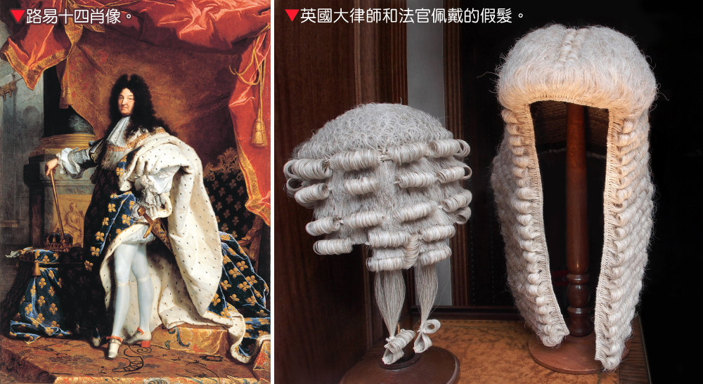 - 在「君權神授」的時代背景下,路易十四不但統治強勢,還十分講究排場,他不但穿絲襪、穿高跟鞋,還戴起誇張的蓬鬆假髮(因為其頭髮稀疏和身高較矮的緣故),以強化其絕對君主的威嚴。由於國王擁有無上的權力,模仿國王的穿著(包括戴假髮)便成為貴族們表達忠誠和尋求地位認可的方式。於是在路易十四的帶動下,佩戴假髮成為一種社會地位和身分的象徵,而路易十四的品味也帶動時尚的潮流,這股風潮不但由英王查理二世傳入英國,也席捲了歐洲大陸,各國貴族競相模仿,連英國法院也受到影響,並被帶到世界各地的英國殖民地法庭上。